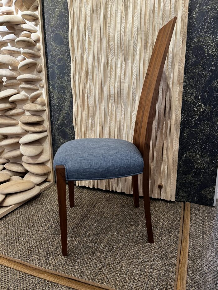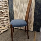 A one off upholstered coopered dining chair in a blue fabric.