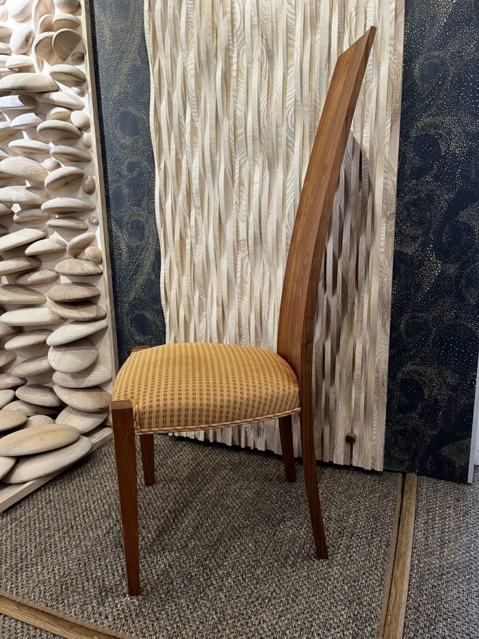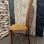 A one off upholstered coopered dining chair in a gold fabric.